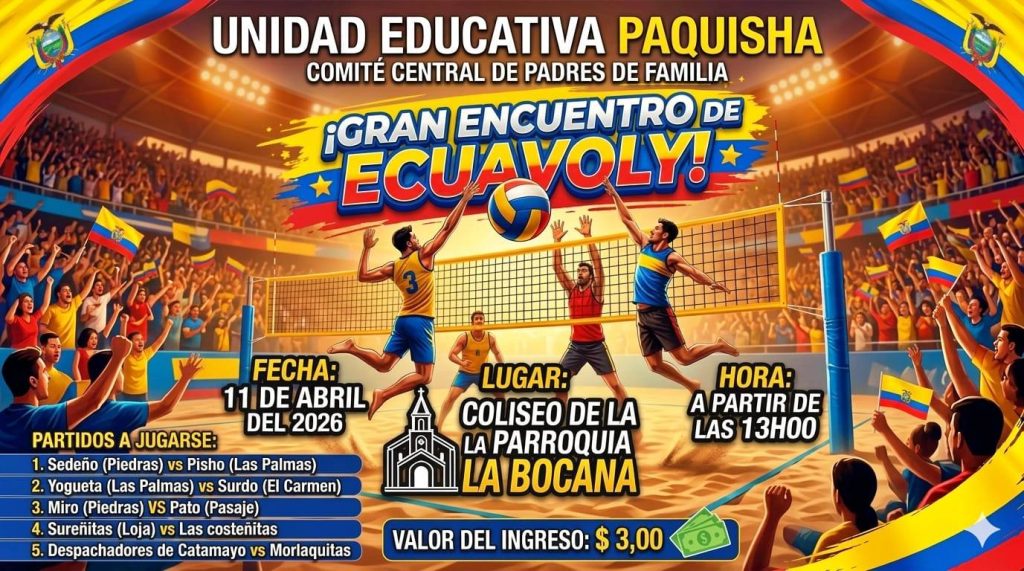 El Comité de Padres de Familia de la UNIDAD EDUCATIVA PAQUISHA tiene el agrado de invitar a toda la comunidad a participar y disfrutar de un emocionante torneo de vóley que se realizará el sábado 11 de abril de 2026. Será una jornada llena de deporte, compañerismo y diversión para jugadores y espectadores. Fecha: Sábado […]